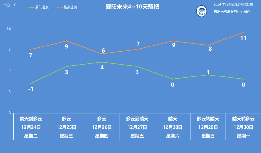 襄阳21日白天到晚上多云,偏北风3到4级,气温0到6度;22日多云转阴天,偏北风2-3级,气温:0-4度;23日阴天转多云,偏北风2-3级,气温0-7度;24日晴天到多云,-1度-7度。