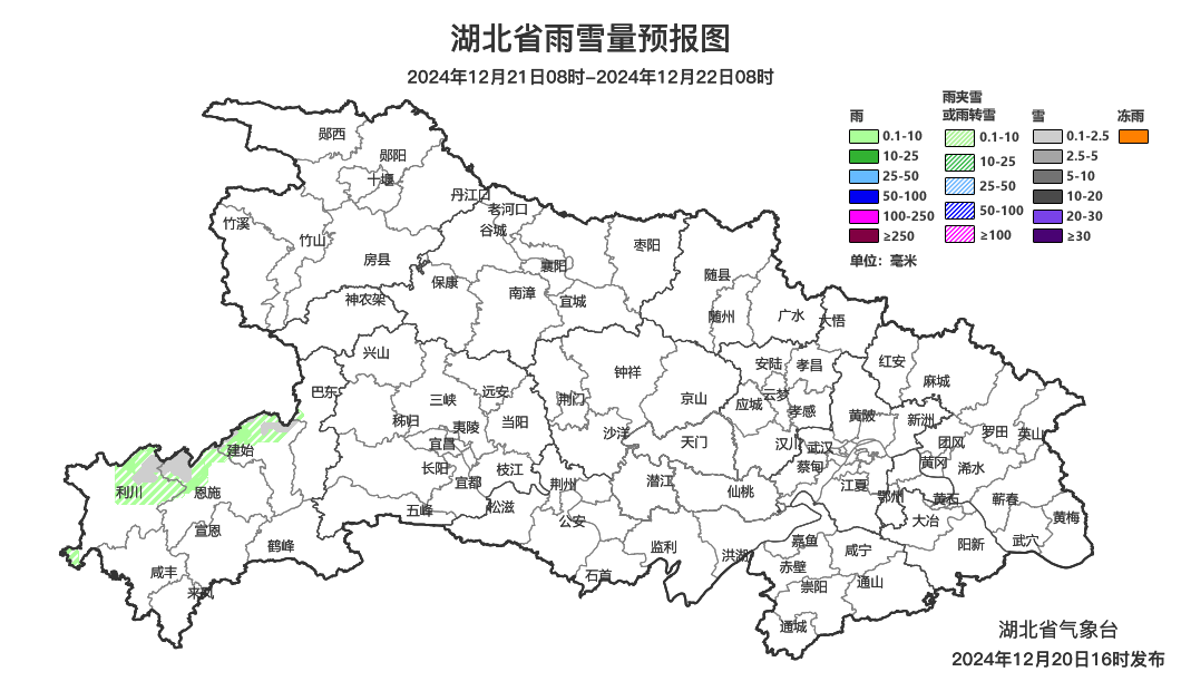 12月22日08时-23日08时,鄂西北、鄂西南阴天有雨夹雪或小雪;其他地区阴天。最高气温3~6℃,最低气温-2~3℃,偏北风2到3级。