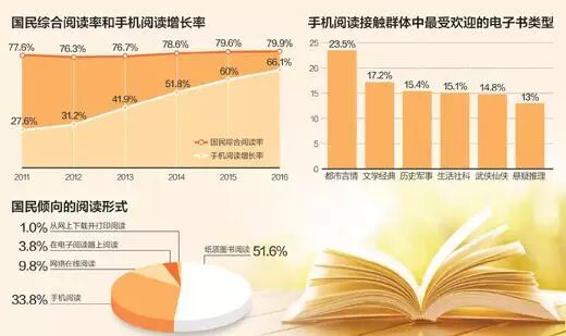 中国新闻出版研究院18日公布了第十四次全国国民阅读调查的主要情况。调查显示,2016年我国成年国民各媒介综合阅读率为79.9%,较2015年的79.6%略有提升,数字化阅读方式的接触率为68.2%,较2015年的64.0%上升了4.2个百分点,图书阅读率为58.8%,较2015年的58.4%上升了0.4个百分点。2016年我国成年国民人均图书阅读量为7.86本,较2015年增加了0.02本。2016年手机阅读率达到66.1%,已经连续8年增长。