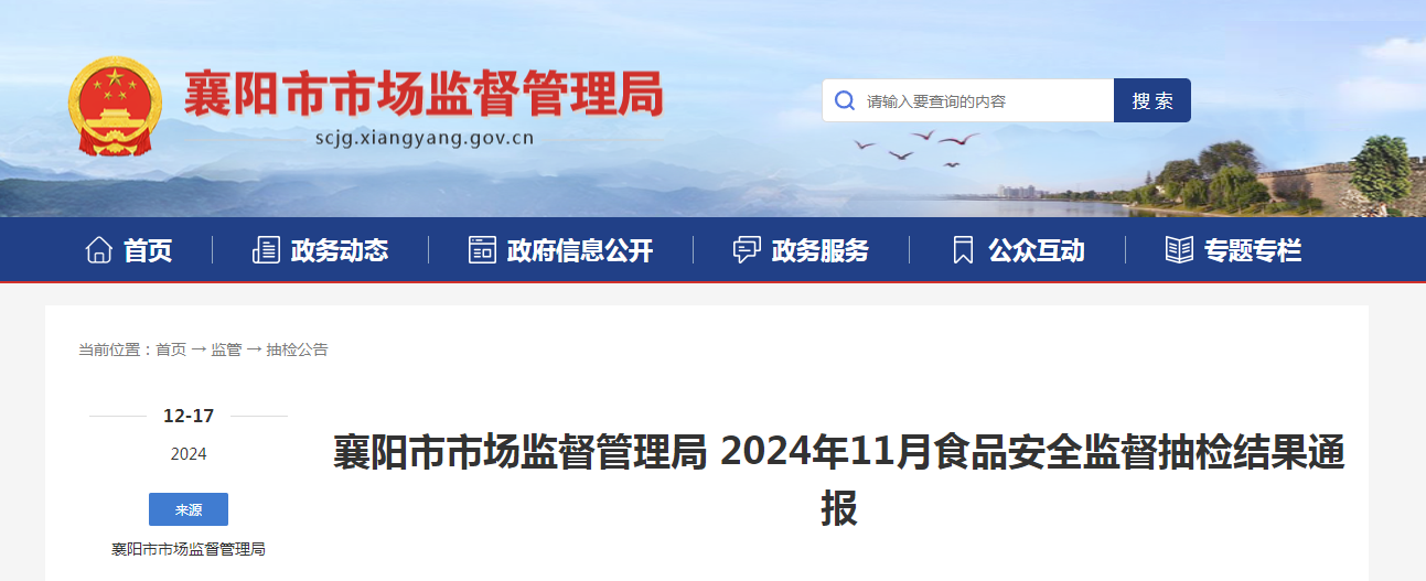 近日,市市场监督管理局网站发布《襄阳市市场监督管理局 2024年11月食品安全监督抽检结果通报》,抽检结果通报如下:
