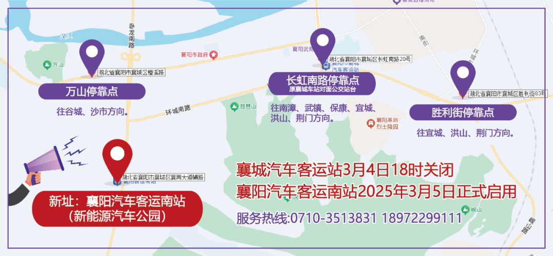 结合襄阳城市规划及客运站设施升级考虑,2025年3月5日起,襄城客运站正式迁移至襄阳客运南站(新能源汽车公园)。原襄城客运站于当日关闭,停止所有客运业务。新站营运时间为每天早上7:00至下午17:00。