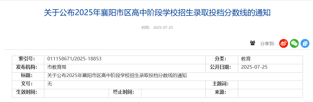 关于公布2025年襄阳市区高中阶段学校
