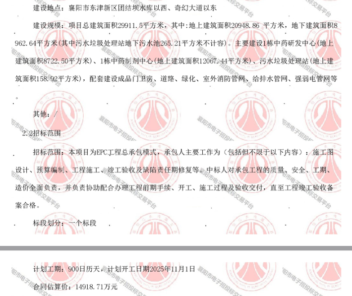 鄂西北(襄阳)区域中医药研发创新中心项目即将开工 ©原创 2025-08-16 20:21 0 8月15日,襄阳市公共资源电子交易平台发布《鄂西北(襄阳)区域中医药研发创新中心项目EPC总承包(XYSZ-JSGC202508FJ-055001001)资审文件公告》,公告显示计划开工日期为2025年11月1日。 (点击图片查看原文) 来源:襄阳市公共资源交易中心 编辑:尹梦媛