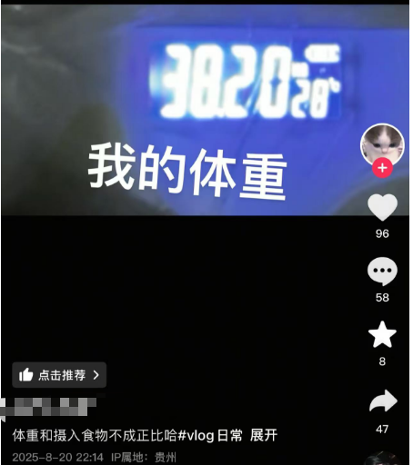 最后一条回复在8月21日,前一天晚上,她发布自己的饭量和体重38.2kg的照片,笑称两者不成正比。