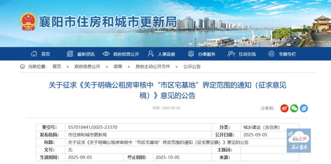 为完善我市住房保障体系,保障公租房公平合理分配,根据《襄阳市人民政府关于修改〈襄阳市市区公共租赁住房管理办法〉的决定》(襄阳市人民政府令第12号)及《襄阳市市区公共租赁住房分配管理实施细则》相关规定,申请人及共同申请人在市区有宅基地的,不得申请公共租赁住房。市住房和城市更新局形成了《关于明确公租房审核中“市区宅基地”界定范围的通知(征求意见稿)》。现向社会公开征求意见。时限为一个月(2025年9月5日-2025年10月5日),相关意见建议请及时反馈。联系人:刘倩;联系电话:0710-3251380;电子邮箱:972342037@qq.com。