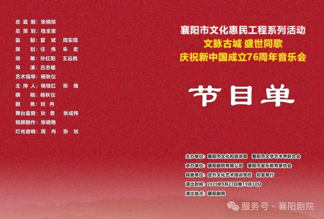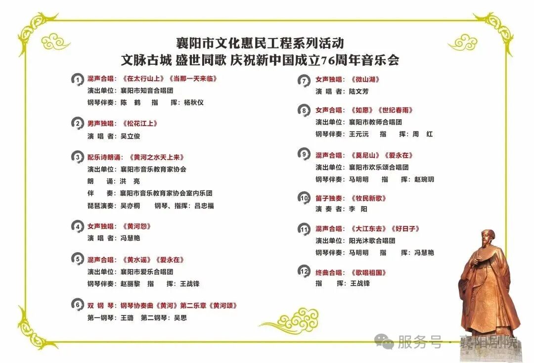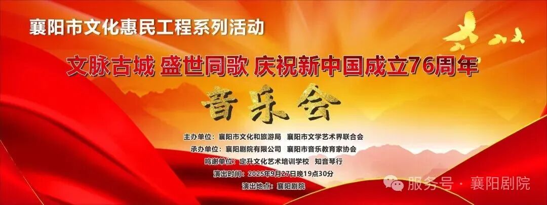 作为襄阳市文化惠民工程的重要活动,本场音乐会坚持惠民原则,旨在让高雅艺术走进寻常百姓家,弘扬中华优秀传统文化,讴歌新中国成立76年来的辉煌成就,进一步增强人民群众的文化获得感与民族自豪感,成为市民触手可及的文化福利。