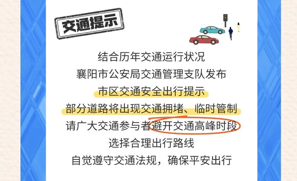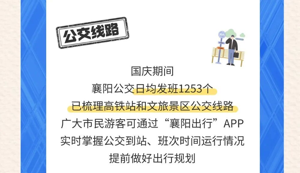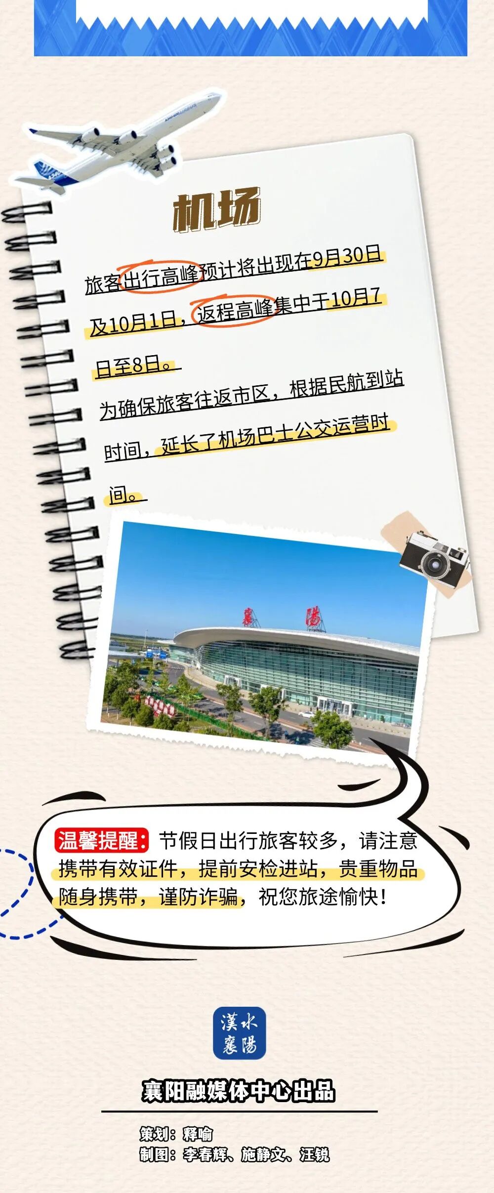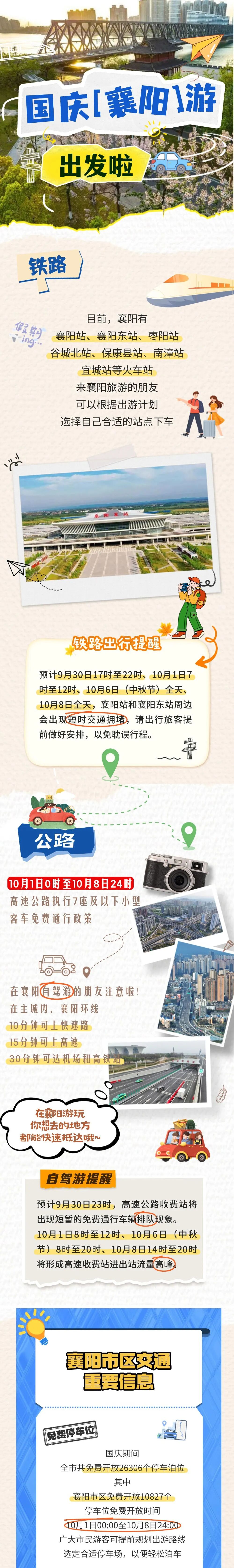 人人人、车车车!国庆来襄阳,最新提示→ ©原创 2025-10-01 08:56 0 放假啦! 国庆假期第一天,你是准备出发 还是已经请假提前“放飞”了? 不少网友分享 各地的高铁站、火车站 高速公路现况 发现全都是人人人、车车车 不过期盼回家、出游的人们 依然心情雀跃 国庆假期 来襄阳的小伙伴注意了 无论你是乘高铁、飞机 还是自驾游 收好这份“交通攻略” 一图了解襄阳最新 免费停车位、交通管制信息、公交线路 ↓↓ 策划:释喻; 制图:李春辉,施静文,汪锐; 编辑:陈忱;校对:王晶; 审核:释喻;终审:刘志国; 运营:襄阳融媒体中心