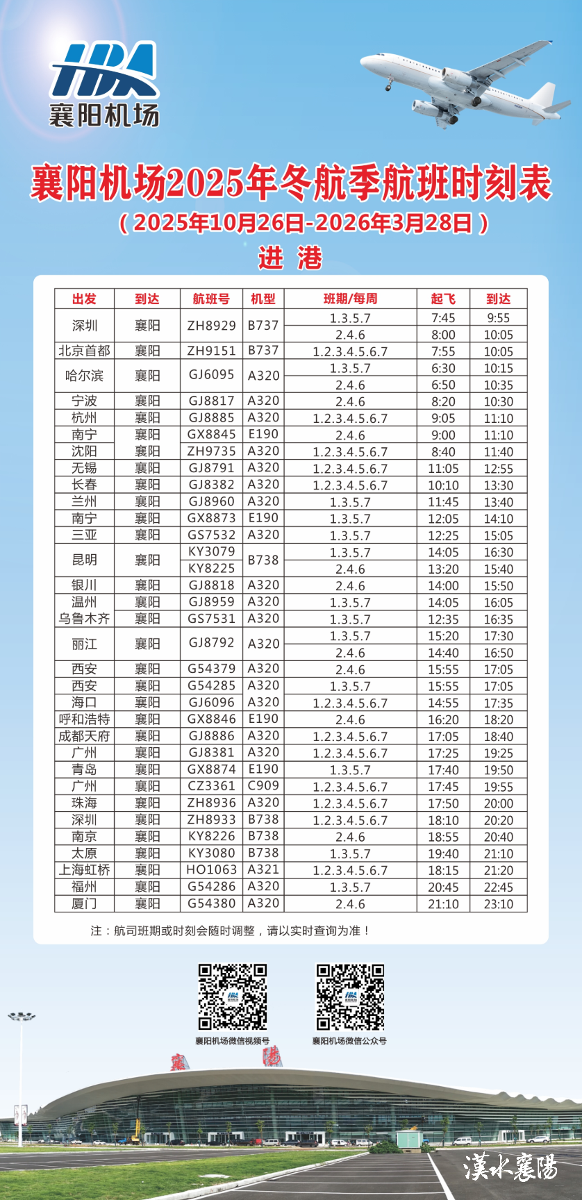 此外,襄阳飞青岛、南宁、呼和浩特等航线班期也有调整,建议旅客在购票时务必注意起飞时刻及航班号,航班最终以实际执行为准。旅客可登陆航空公司官网或拨打客服电话咨询,还可以通过飞常准、航旅纵横等官方APP随时了解航班动态,合理安排出行。