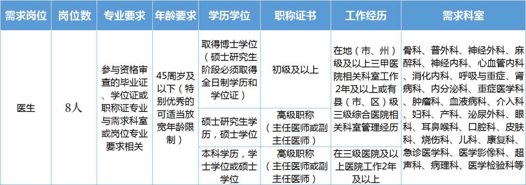 8名医学博士或学科带头人,详见附件1《岗位需求表》。