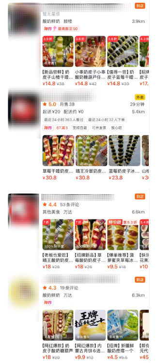 还有更创新的“全能型”,把山楂换成阳光玫瑰、草莓甚至无花果、菠萝蜜、榴莲中间填上干噎酸奶,最后再贴一层奶皮子,几乎集齐了所有网红元素。