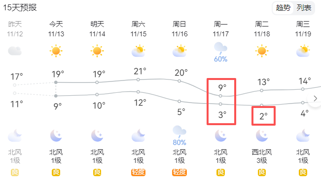 据@中国天气消息,11月15日起,中东部大部地区将出现降温,部分地区降温可超12℃。17日至18日,南北方将迎来本次降温过程的气温低点,最高气温20℃线将退至华南沿海,最低气温0℃线将南压至江淮一带。气温创新低,多座城市将在这次降温过程迎今年下半年来最冷白天,襄阳接下来也将迎来大降温,18日最低温度或降至2℃。【阅读详情】