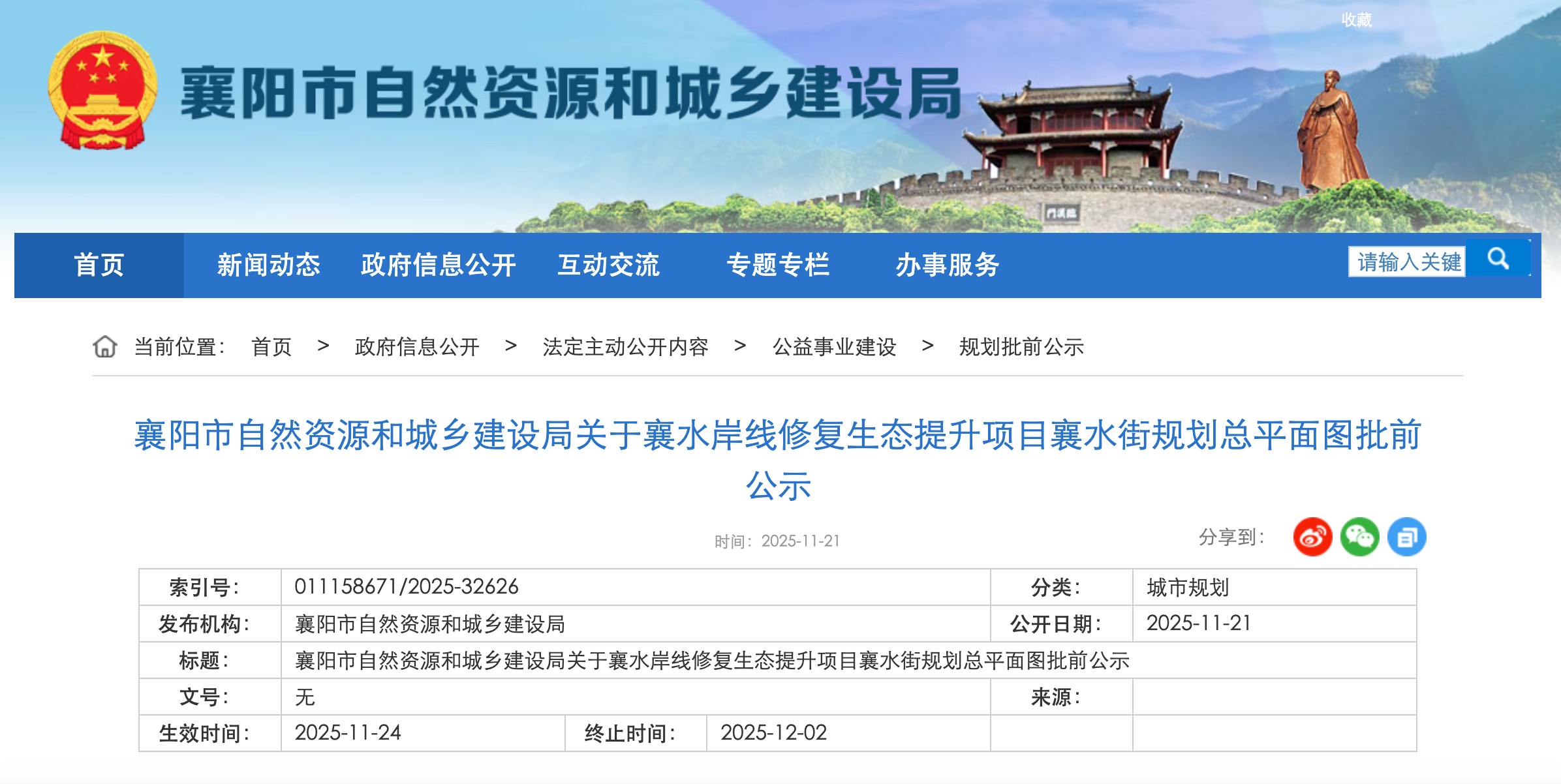 最新规划公示!涉及襄水街 2025-11-21 20:38 襄阳市自然资源和城乡建设局 0 11月21日,襄阳市自然资源和城乡建设局发布关于襄水岸线修复生态提升项目襄水街规划总平面图批前公示。 襄水岸线修复生态提升工程(襄水街)位于襄城区环城南路以北,由襄阳汉江生态经济带投资建设有限公司开发建设。 根据建设单位提供的建设工程设计方案,该项目总建筑面积21803.83㎡,其中地上计容面积13460.77㎡。 来源:襄阳市自然资源和城乡建设局 编辑:苏琦琦