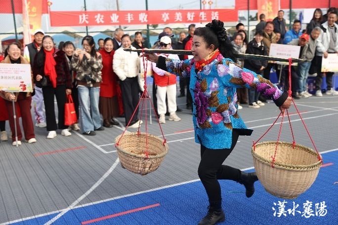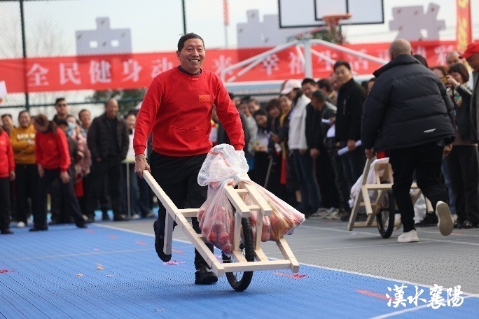 “准备——开始!”随着一声令下,参赛选手挑起装满红薯和萝卜的扁担,在20米折返赛道上健步如飞。随后的“车载丰年”推车赛中,木质小轮车吱呀作响,载着农产品冲向终点。11月22日上午,襄阳市“农民丰收节”农民健身趣味运动会在樊城区太平店镇李家湾村火热开场。