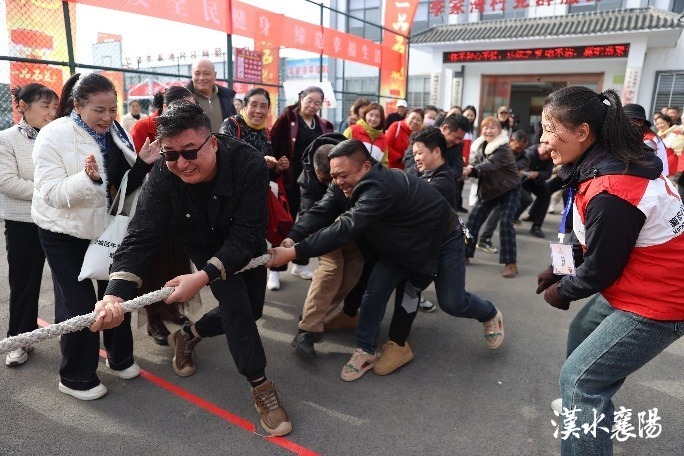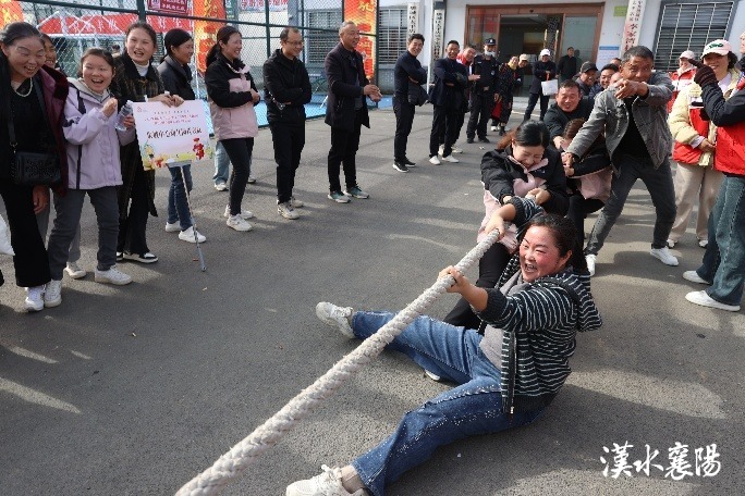 运动场上的加油声、欢笑声此起彼伏。“瞄准,投!”在丰收投壶区,参赛者用蚕豆代替箭矢,向壶内投掷。牛首社区代表队的选手们全神贯注,每一次投中都引来阵阵喝彩。“沃土争锋”田间拔河比赛村委会门前举行,每队7男3女奋力拉扯,成为最具人气的比赛。这些项目设计巧妙融合农耕元素与体育竞技,让日常农活变成了趣味运动。来自太平店镇的李大叔笑着说:“干了一辈子农活,第一次把挑担子变成了比赛,太有意思了!”