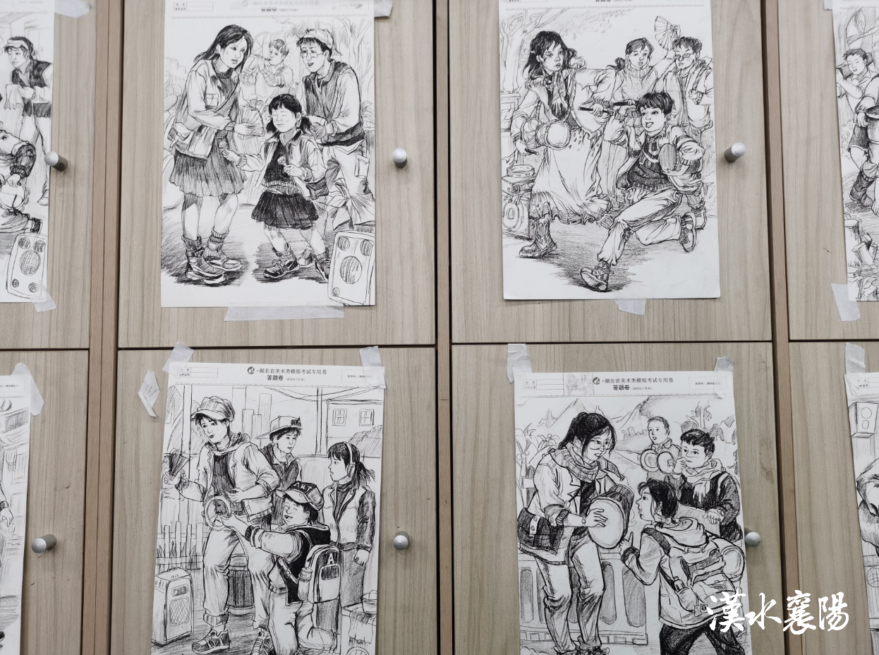 统考在即,对于考生们普遍反映挑战最大的速写综合能力科目,市二十四中速写创作课老师杨千就建议,应考时构图一定要讲规律。杨千说:“以这张画为例,在这幅画面中,三人组合,人物有大有小,有高低错落,场景道具近景中景远景相对完整,这种画面就是相对好的一张画面。构图过小,使画面显得空,构图过大,画面会显得拥堵,所以我们构图一定要适中,人物之间要有遮挡关系 。”