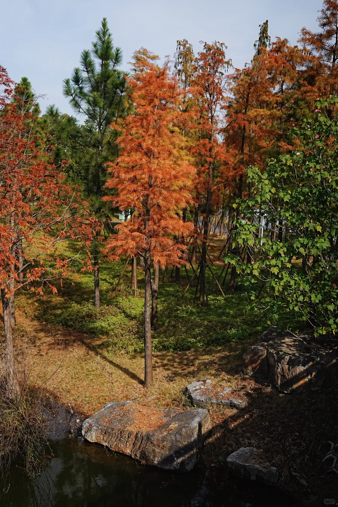 秋冬时节的鱼梁洲中央生态公园,是被大自然打翻的调色盘。100余亩池杉、水杉、落羽杉次第换装,3000余株林木褪去盛夏的青绿,换上金黄、橙红与红褐色的盛装,层层叠叠的色彩在阳光下愈发鲜亮。