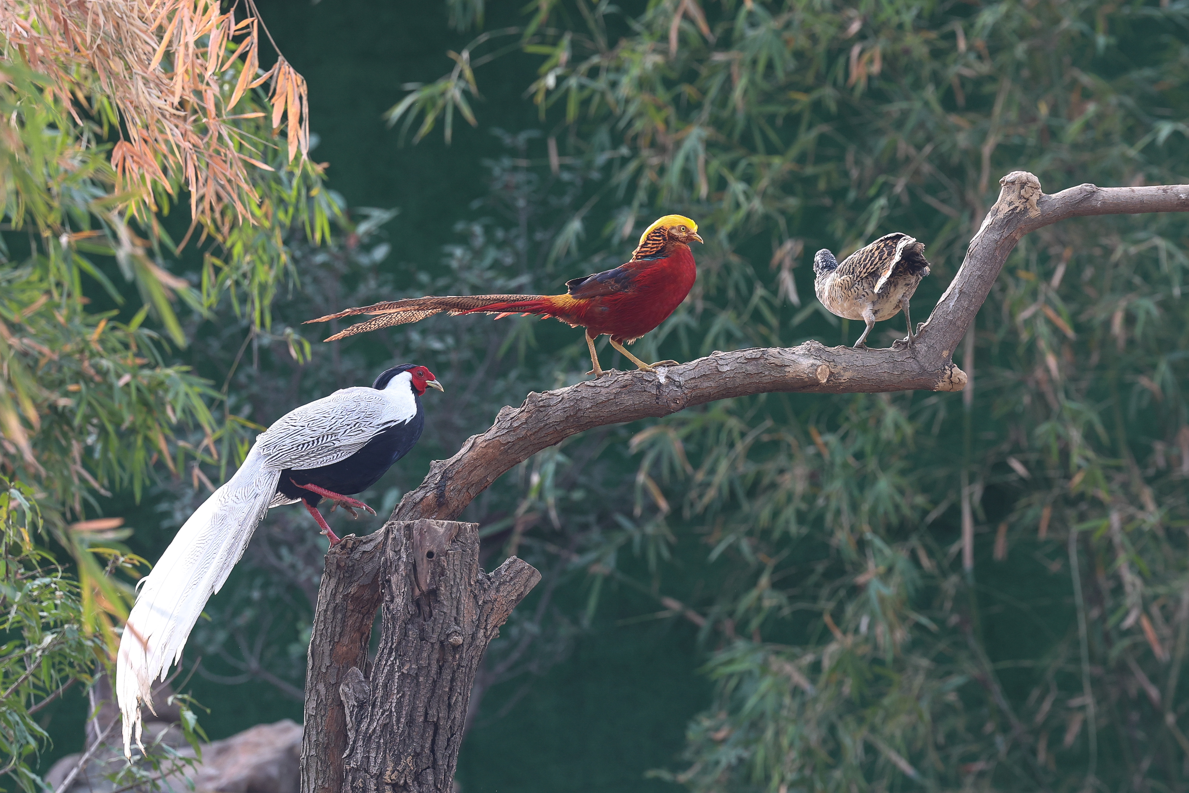 在鱼梁洲普罗旺斯庄园观鸟站拍摄的国家二级保护动物白鹇(左1)、红腹锦鸡(左2)。