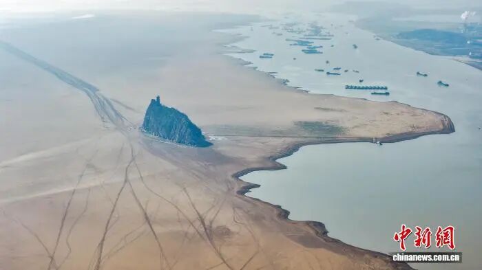 12月14日,江西湖口,随着鄱阳湖水位走低,昔日丰水期被淹水中的鞋山岛露出水面。
