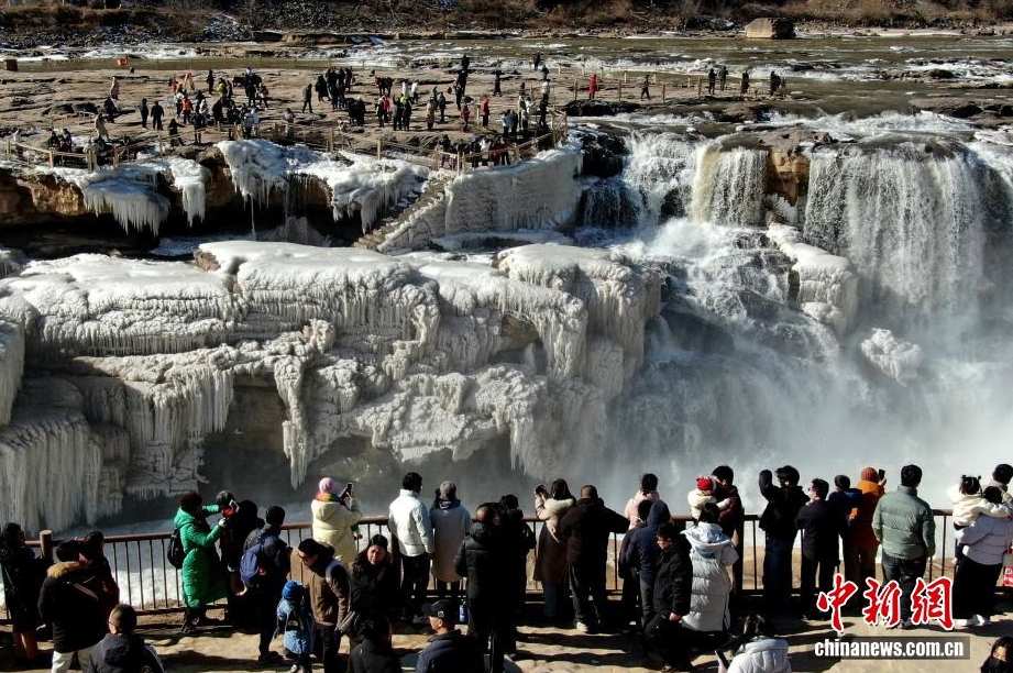 ■ 连日来,受持续降温天气影响,位于山西吉县和陕西宜川县交界的黄河壶口瀑布出现冰瀑玉壶景观,层层叠叠的冰瀑在阳光的照射下,洁白如玉,晶莹剔透,吸引了众多游客。