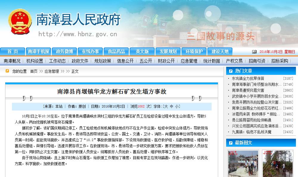 据南漳官方通报:10月2日上午10:30左右,位于南漳县肖堰镇响水洞村三组的华龙方解石矿员工在检修设备过程中发生山体塌方,导致5人失联、两台挖掘机被垮落块石掩埋。