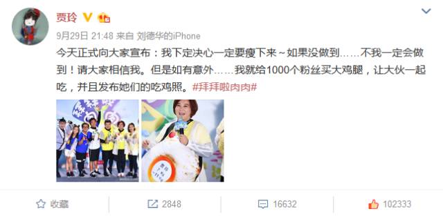 当然参加了《拜拜啦肉肉》这档减肥节目,贾玲就算是被全国人民监督减肥了,为了表达决心贾玲也在微博发话了,减不下来就给大家买大鸡腿↓