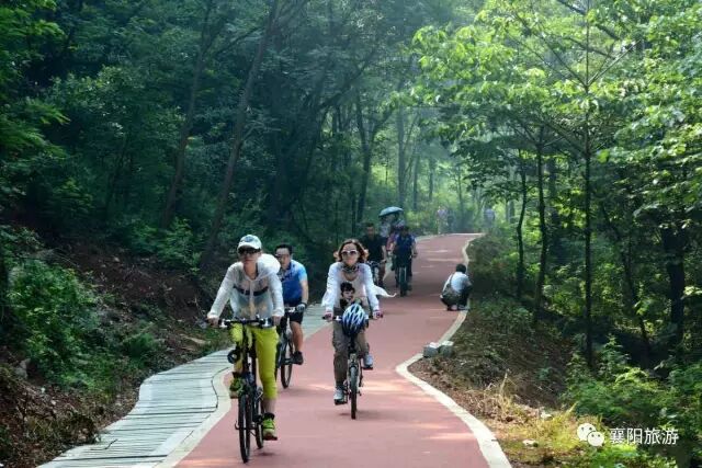 襄阳绿道岘山段全长6.8公里,有羊祜山、钓鱼洼两个环线,呈“8”字形,骑行爱好者可由烈士陵园广场、陵园路、翠屏山庄等处进入。建设者为了方便市民骑行,专门铺上了砖红色的防滑沥青,配合白色的交通标线,在周边树木植物衬映下,整体视觉效果鲜明醒目,大大增强了山路骑行的安全性。