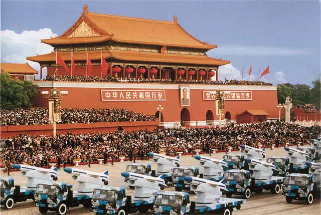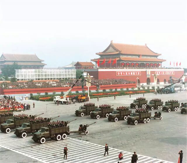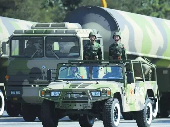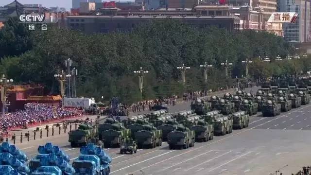 在此次阅兵式上,48台东风军车分为三个方队,三吨半越野车牵引着榴弹炮、两吨半越野车拉着导弹,轮式装甲车紧随其后,所有车辆全数安全通过。