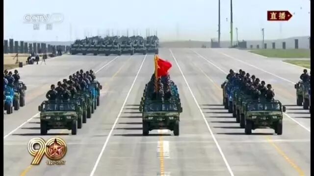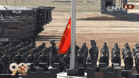 中国共产党党旗、中华人民共和国国旗、中国人民解放军军旗,三面旗帜交相辉映,在200余名官兵与东风“猛士”的护卫下迎风招展。