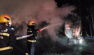 惊险!高速路上油罐车轮胎着火,交警消防联手...